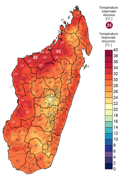 Pour cette semaine (08 au 14 Décembre 2025), une augmentation progressive des températures maximales est prévue presque dans toute Madagascar. Les températures maximales prévues seront généralement comprises entre 25°C et 39°C. La valeur maximale absolue est prévue dans les districts de Betioky-atsimo, et Ampanihy. Pour le Nord, les températures maximales prévues seront comprises entre 29°C et 33°C ; pour l’Est entre 29°C et 34°C ; pour l’Ouest entre 27°C et 38°C ; pour le Sud entre 32°C et 39°C et pour les hautes terres centrales entre 25°C et 33°C.