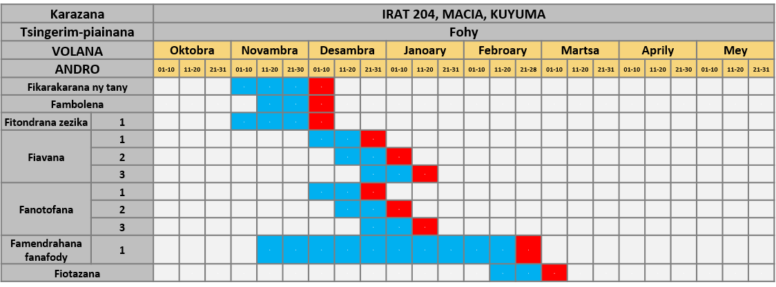 Raha eo anelanelan’ny 11 sy 20 Desambra no atao ny fambolena (efamira voamarika X), dia tokony tanterahina mialoha io vanim-potoana io ny fikarakarana ny tany sy ny fitondrana zezika. Tanterahina eo anelanelan’ny 01 sy 10 Janoary (efamira voamarika X) ny fiavàna sy fanotofana voaloahany, ary manaraka izay ny sisa. Eo anelanelan’ny 11 sy 20 Marsa kosa ny fiotazana.